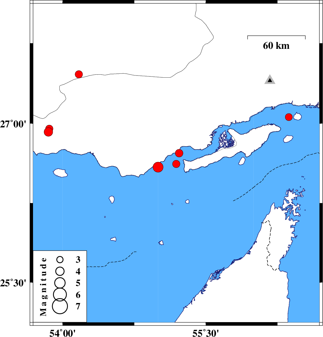 | 2019/07/22 | 23:20:39.9 | 03:50:39.9 | 26.72 | 55.22 | 14 | ML3.6 | Persian Gulf, 43 km North-East of Bandar-e lengeh | ||