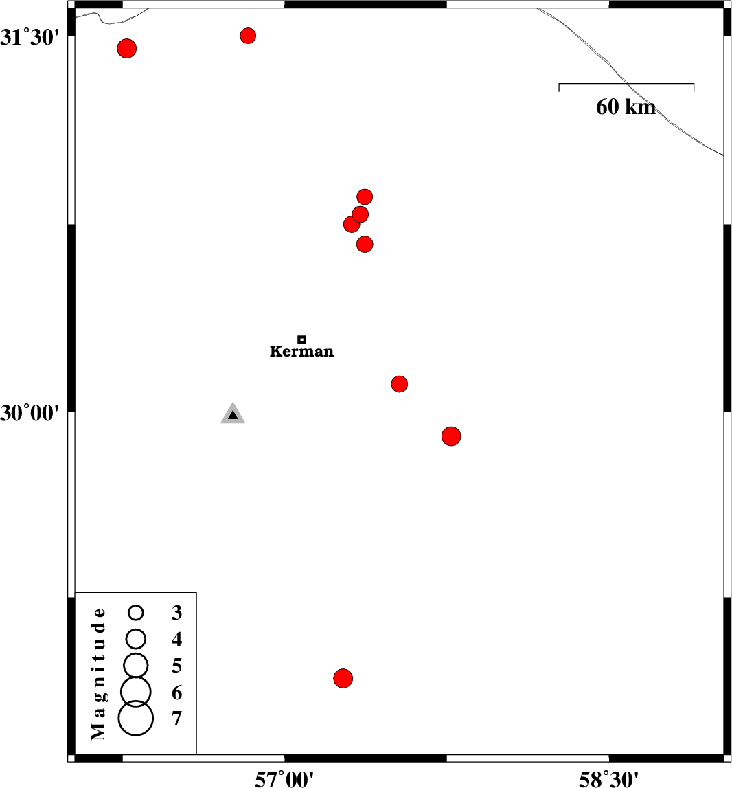 | 2019/06/24 | 21:02:00.7 | 01:32:00.7 | 29.9 | 57.77 | 9 | Mb3.9 | Kerman Province, 79 km South-East of Kerman |