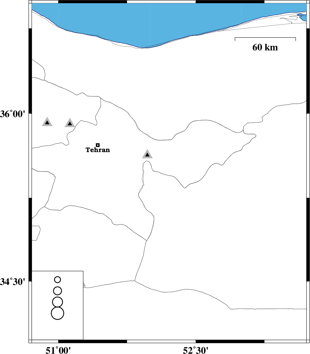 | 2019/07/24 | 23:28:13.4 | 03:58:13.4 | 35.47 | 52.21 | 12 | ML3 | Tehran Province, 30 km North-West of Garmsar |