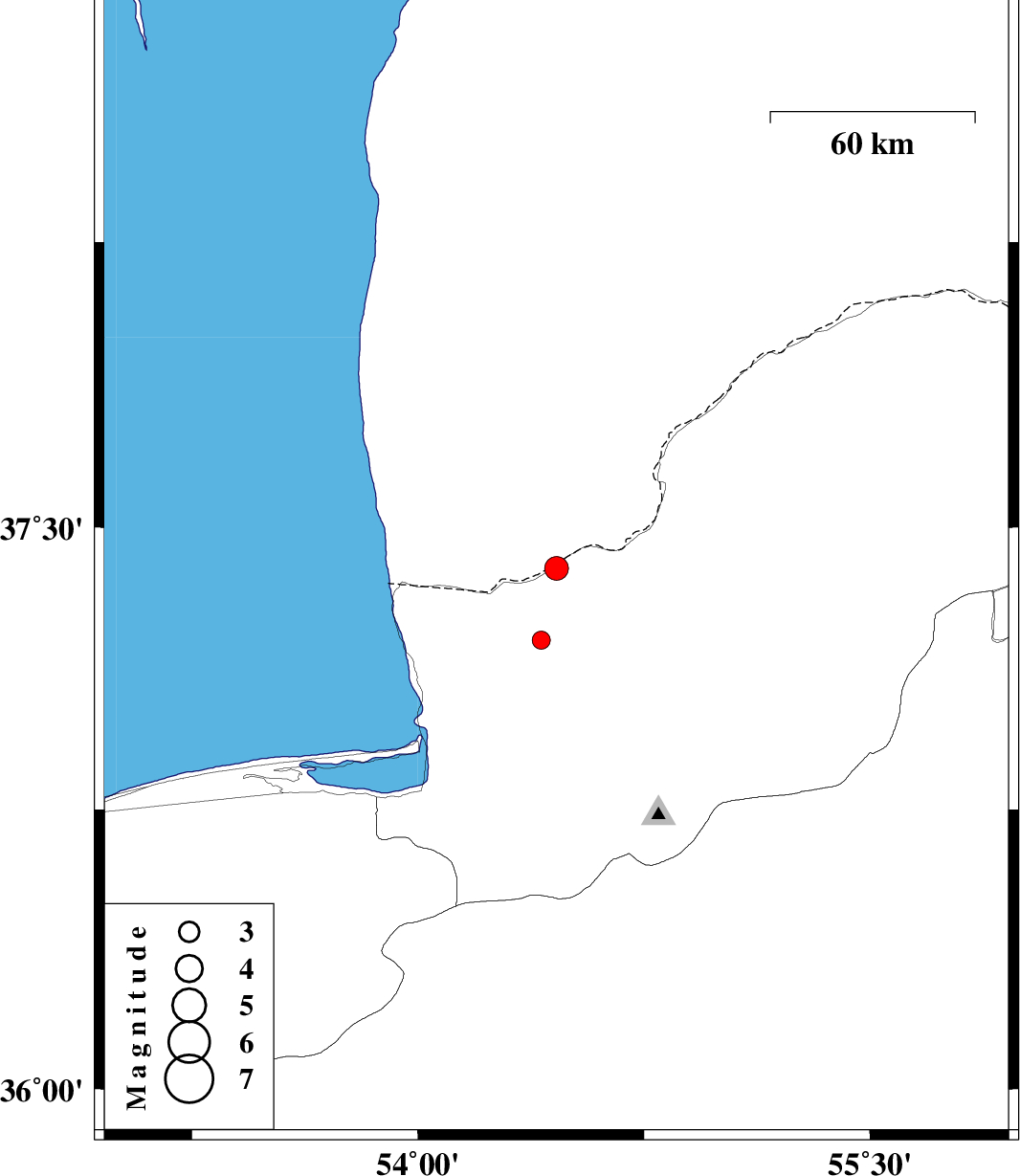 | 2019/07/28 | 16:01:45.6 | 20:31:45.6 | 37.39 | 54.46 | 31 | ML3.5 | Golestan Province, 42 km North of Aq Qaleh | ||