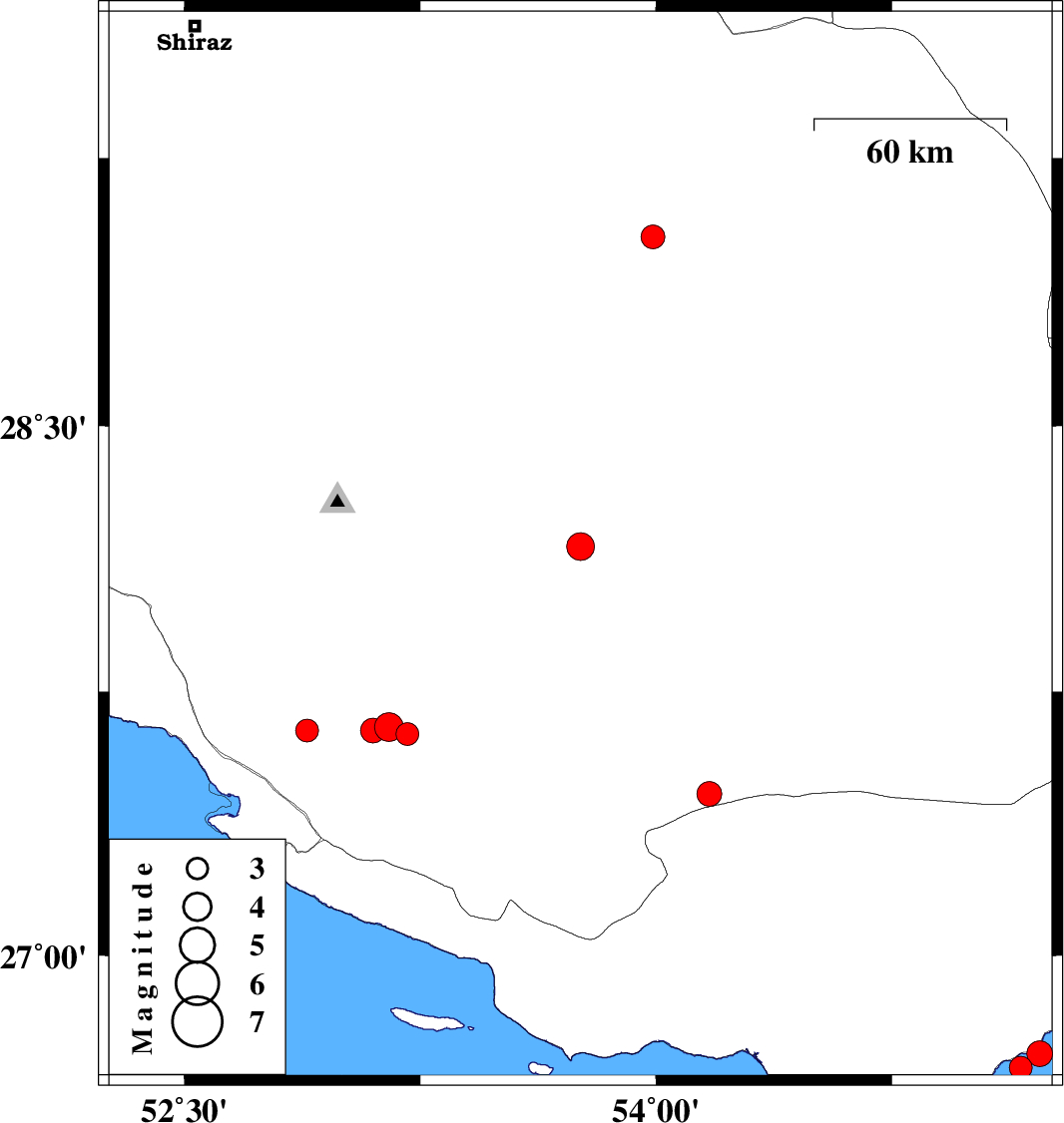 | 2019/07/22 | 23:20:39.9 | 03:50:39.9 | 26.72 | 55.22 | 14 | ML3.6 | Persian Gulf, 43 km North-East of Bandar-e lengeh | ||