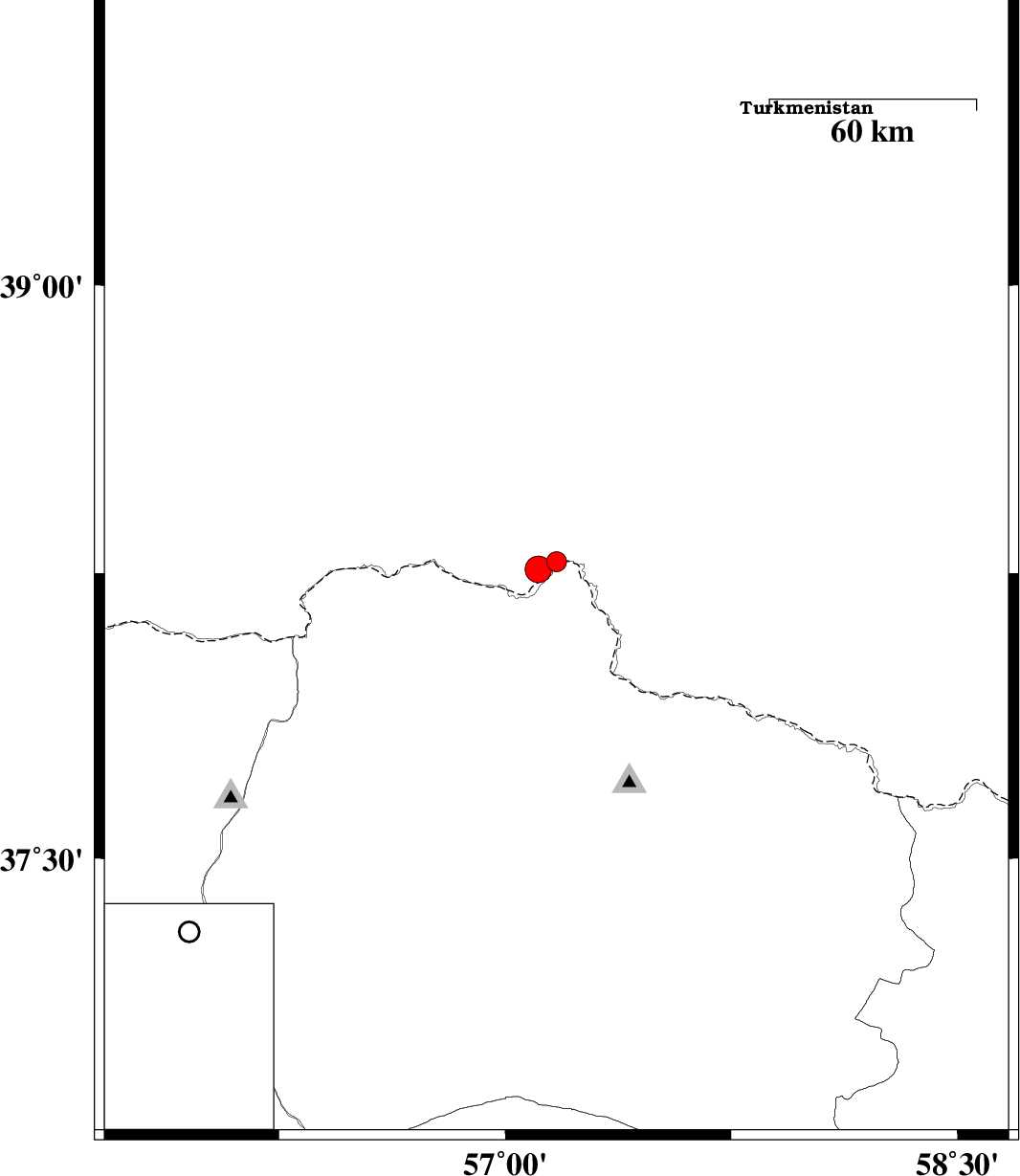 | 2019/07/29 | 09:27:51.0 | 13:57:51.0 | 38.26 | 57.11 | 12 | Mb3.9 | Turkmenistan, 80 km North-East of Ashkhaneh |