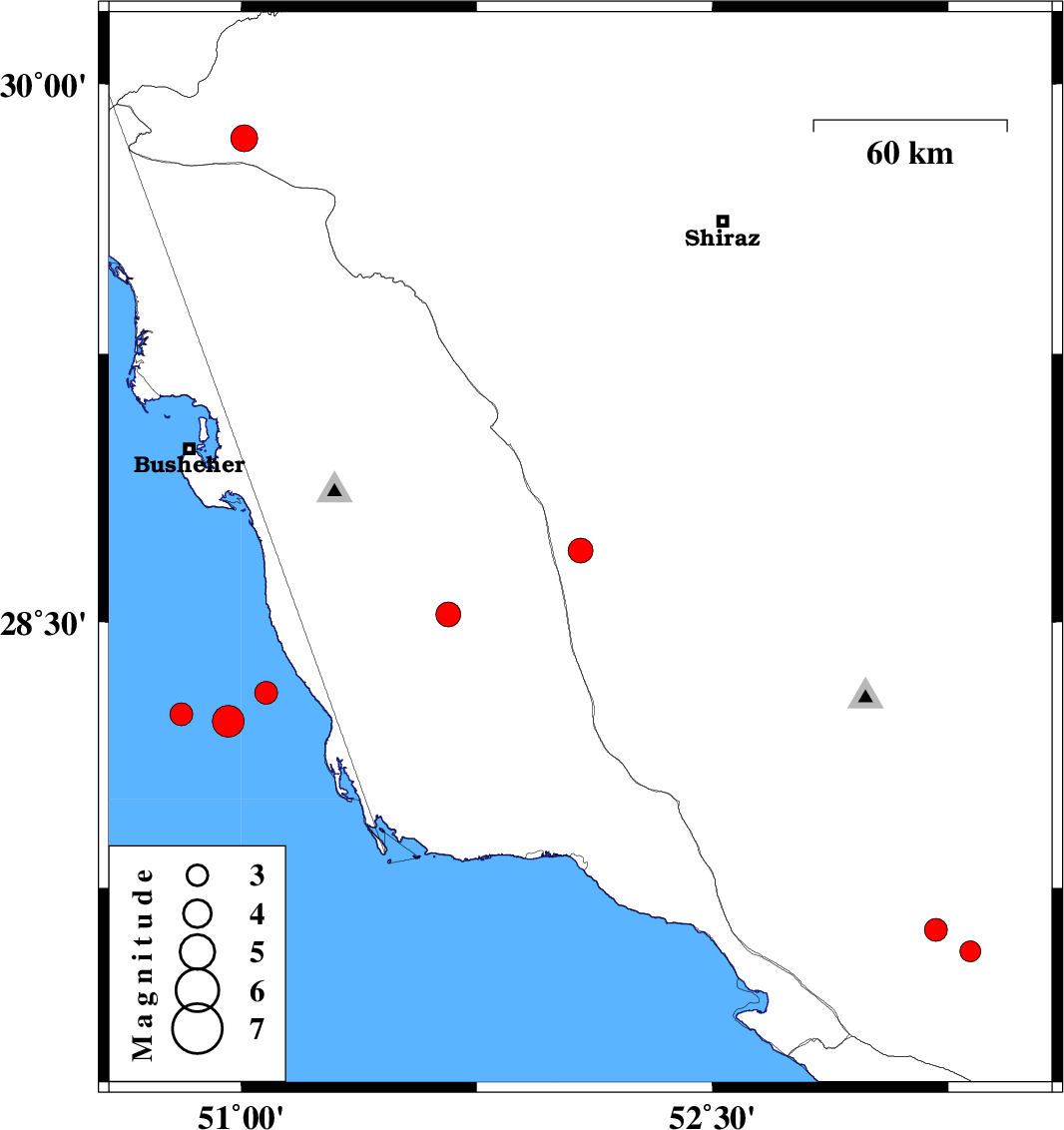 | 2019/07/23 | 19:41:56.2 | 00:11:56.2 | 28.52 | 51.66 | 15 | ML3.5 | Bushehr Province, 32 km South-East of Khormog | ||
