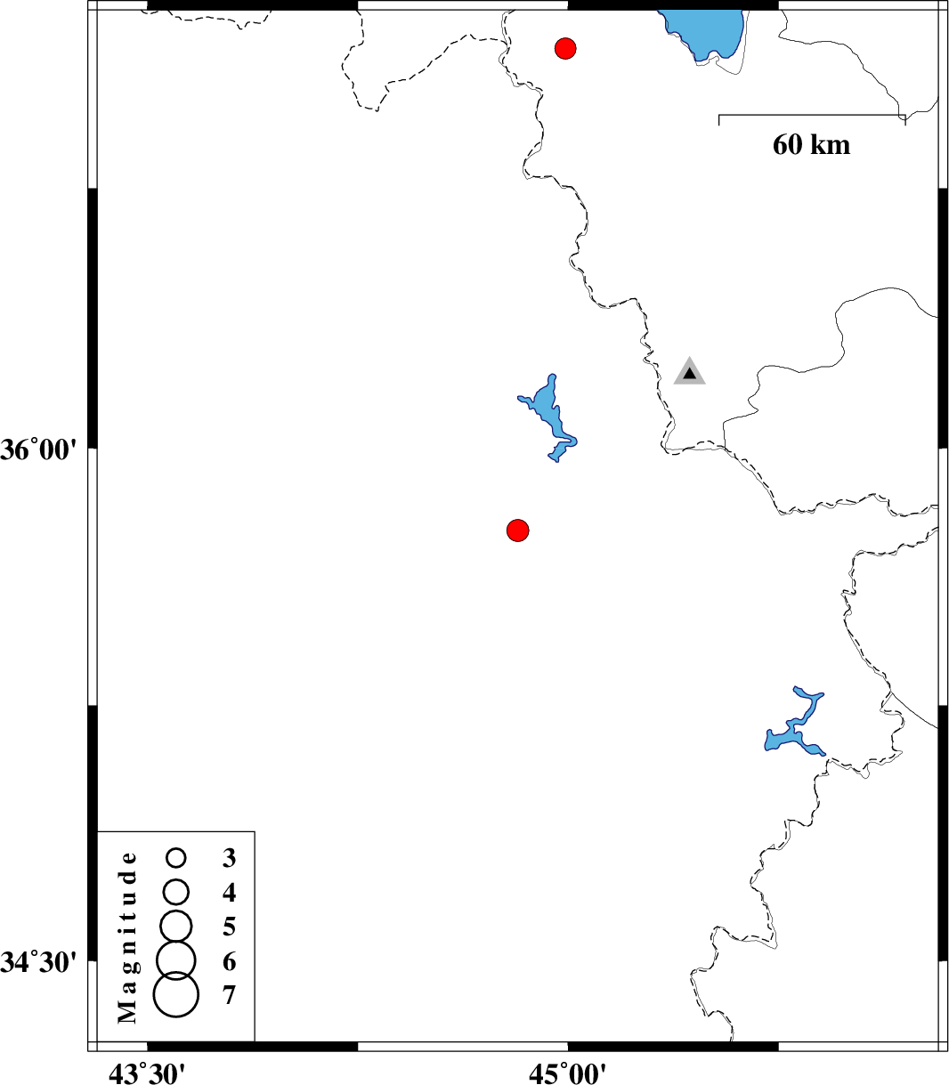 | 2019/08/24 | 13:48:48.3 | 18:18:48.3 | 35.76 | 44.82 | 9 | ML3.5 | Iraq, 60 km North-West of Sulaymaniyah | ||