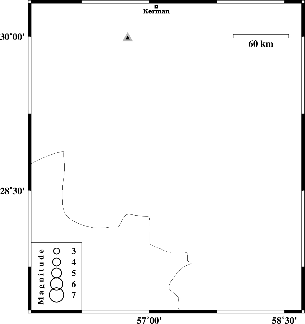 | 2019/08/26 | 20:24:12.8 | 00:54:12.8 | 28.82 | 57.19 | 14 | ML3.2 | Kerman Province, 56 km North-West of Jiroft |
