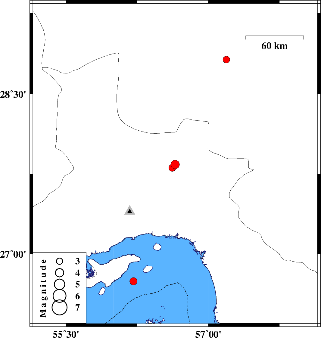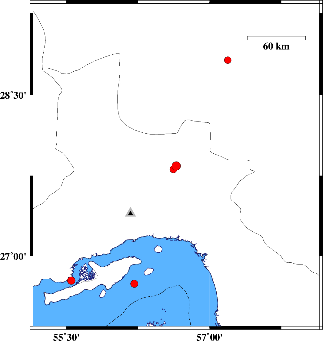 | 2019/08/26 | 20:24:12.8 | 00:54:12.8 | 28.82 | 57.19 | 14 | ML3.2 | Kerman Province, 56 km North-West of Jiroft | ||