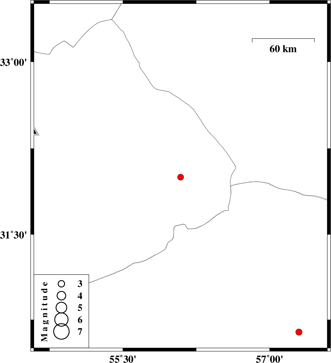 | 2019/08/29 | 17:02:55.1 | 21:32:55.1 | 30.64 | 57.3 | 15 | ML3 | Kerman Province, 45 km North-East of Kerman |