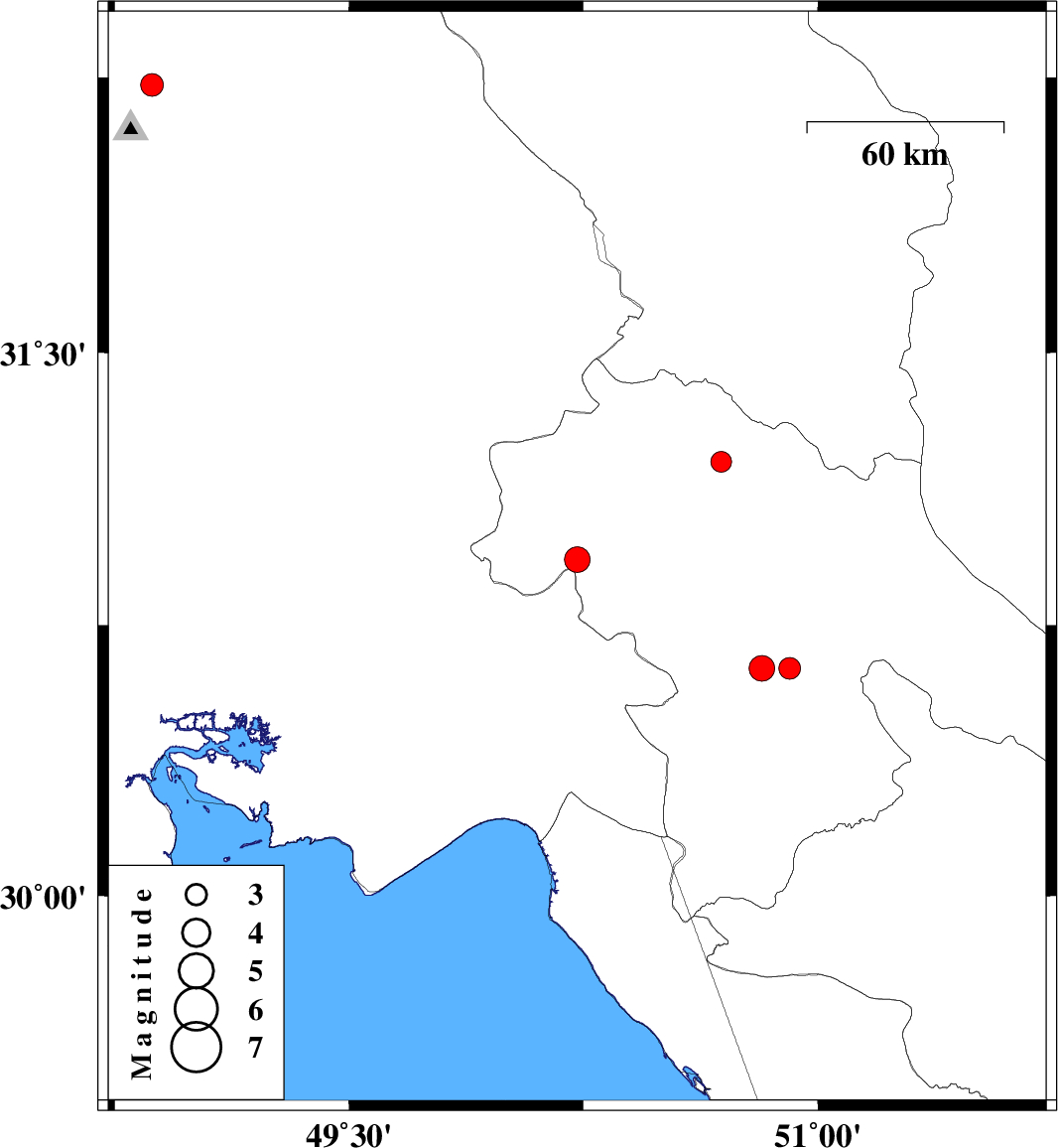 | 2019/08/26 | 20:44:05.2 | 01:14:05.2 | 32.23 | 48.87 | 14 | ML3.2 | Khoozestan Province, 21 km North of Shushtar |