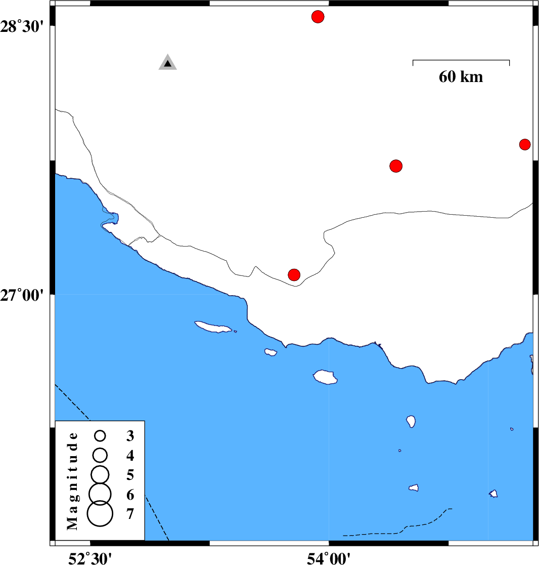 | 2019/09/06 | 14:22:50.9 | 18:52:50.9 | 28.55 | 53.93 | 11 | ML3.5 | Fars Province, 37 km -East of Jahrom |