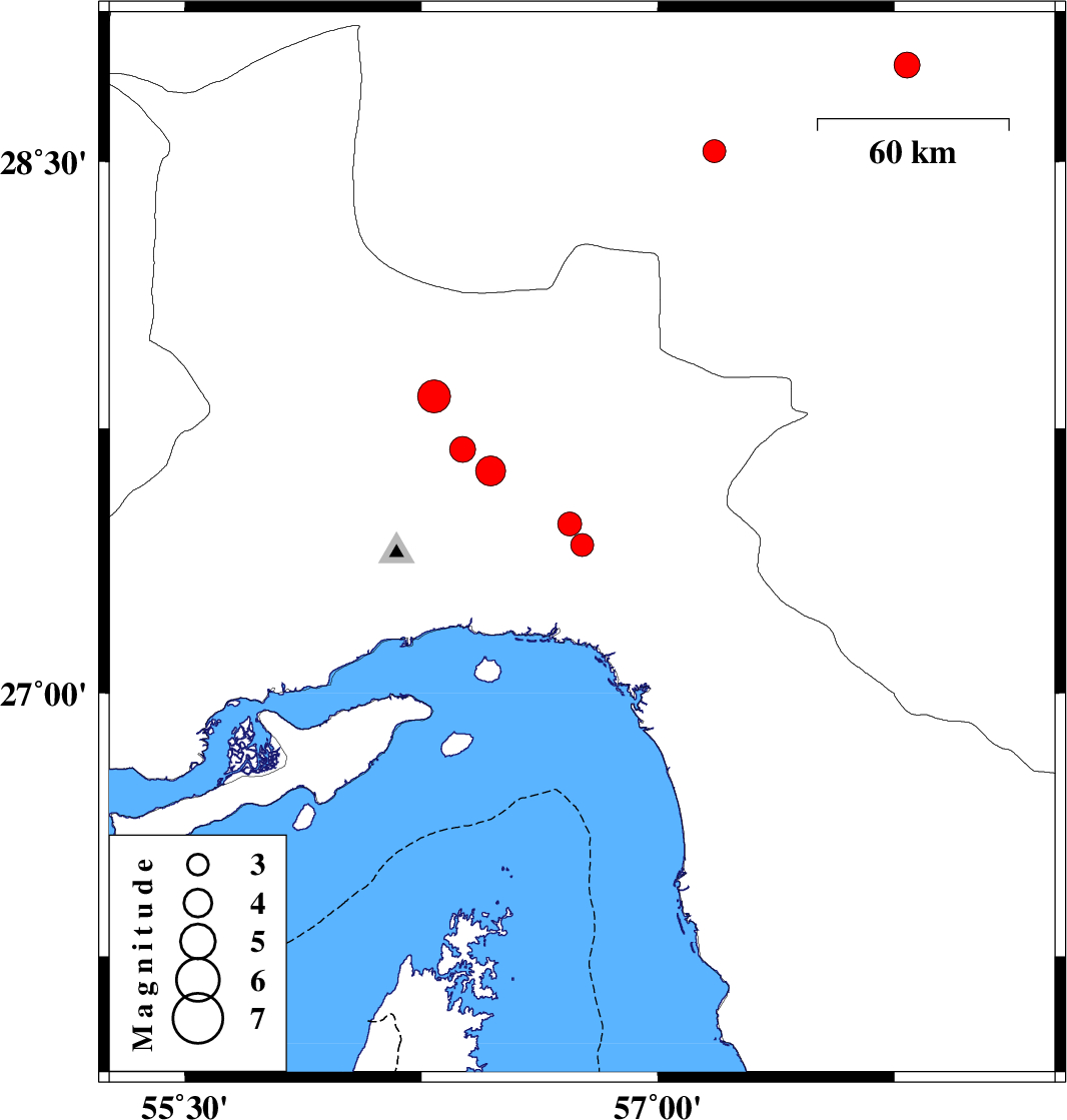 | 2019/09/16 | 20:03:24.2 | 00:33:24.2 | 27.63 | 56.47 | 12 | ML4.3 | Hormozgan Province, 53 km North-East of Bandar-e abbas | ||