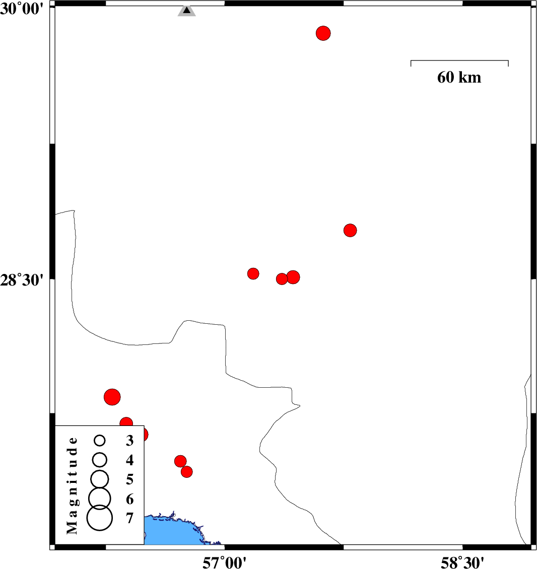 | 2019/09/23 | 12:23:17.2 | 15:53:17.2 | 28.5 | 57.36 | 14 | ML3.3 | Kerman Province, 42 km South-West of Jiroft | ||