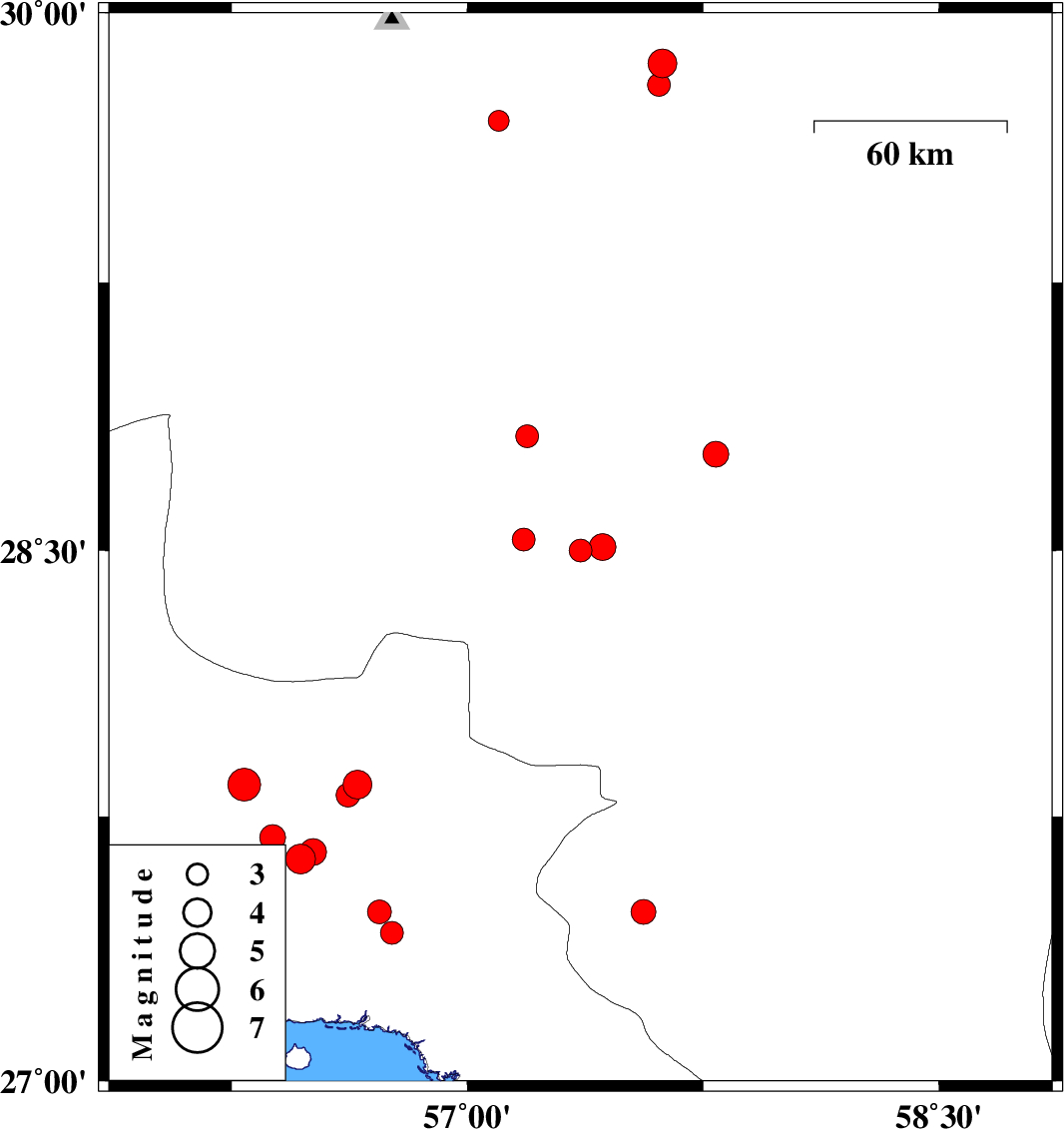 | 2019/09/13 | 21:05:43.2 | 01:35:43.2 | 29.7 | 57.1 | 11 | ML3 | Kerman Province, 65 km South of Kerman | ||