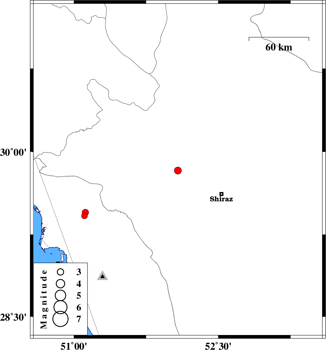 | 2019/09/22 | 19:04:16.1 | 22:34:16.1 | 29.45 | 51.12 | 14 | ML3.1 | Bushehr Province, 23 km North of Borazjan |