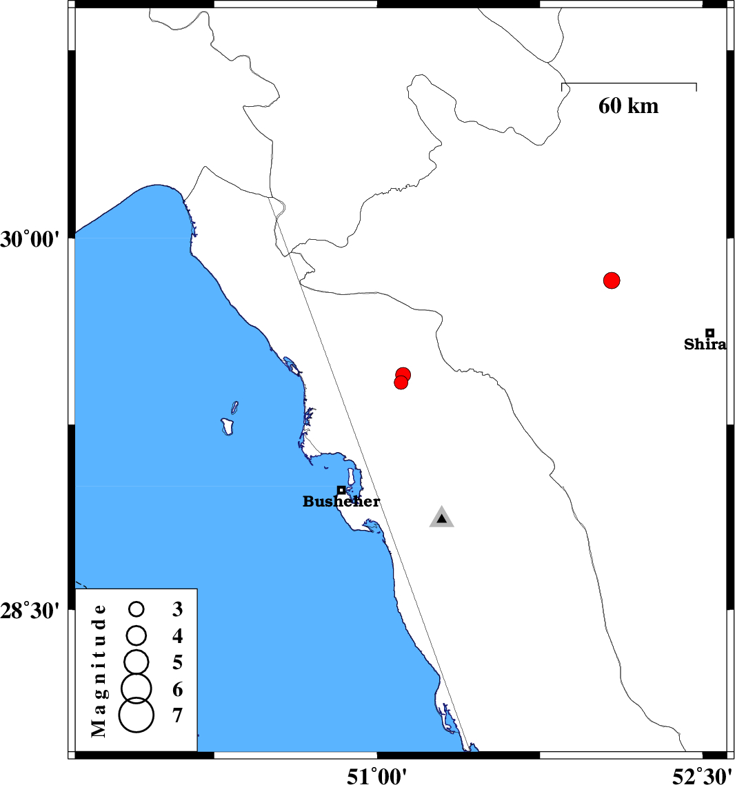 | 2019/09/22 | 19:04:16.1 | 22:34:16.1 | 29.45 | 51.12 | 14 | ML3.1 | Bushehr Province, 23 km North of Borazjan |