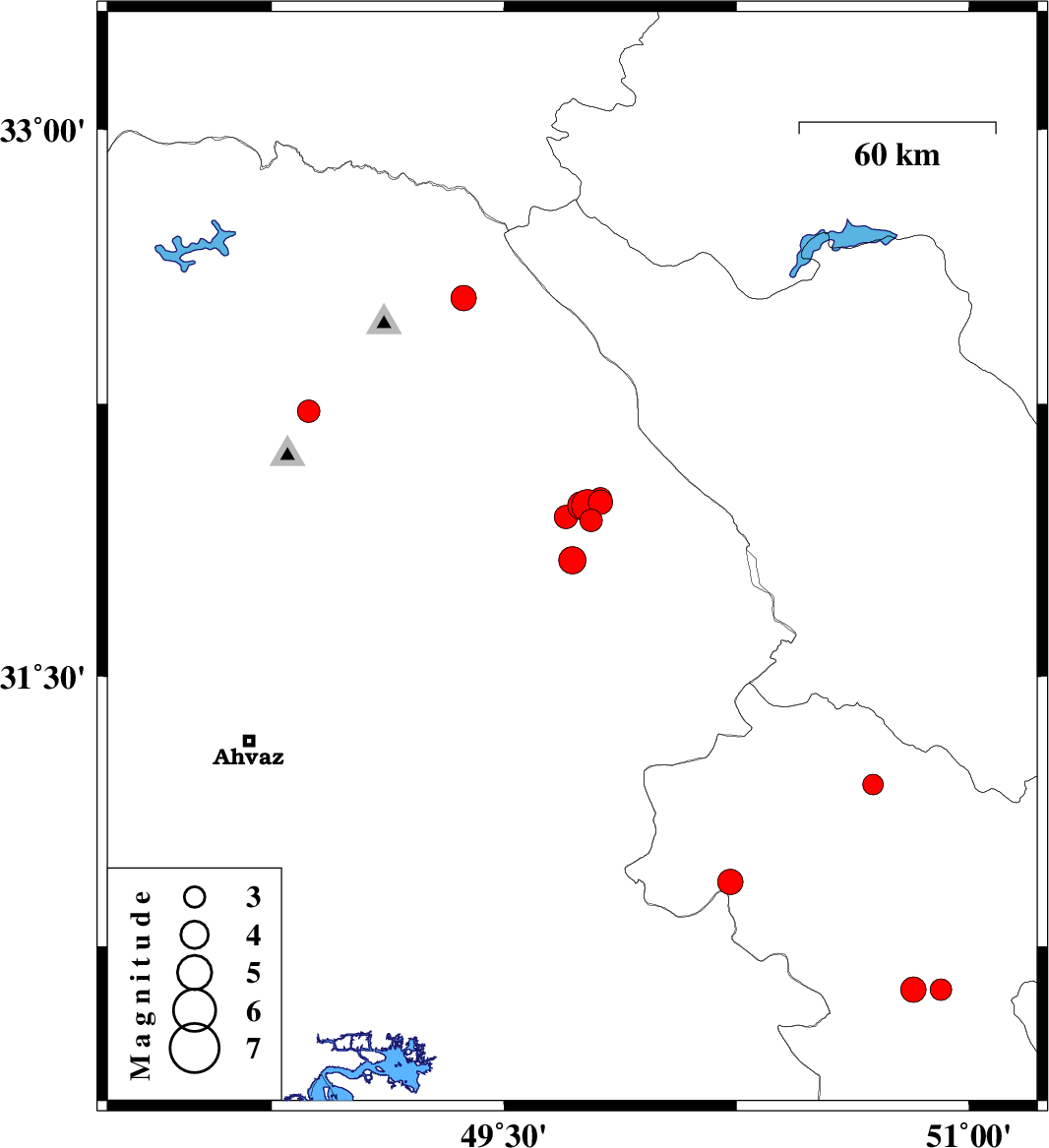 | 2019/08/26 | 20:44:05.2 | 01:14:05.2 | 32.23 | 48.87 | 14 | ML3.2 | Khoozestan Province, 21 km North of Shushtar |