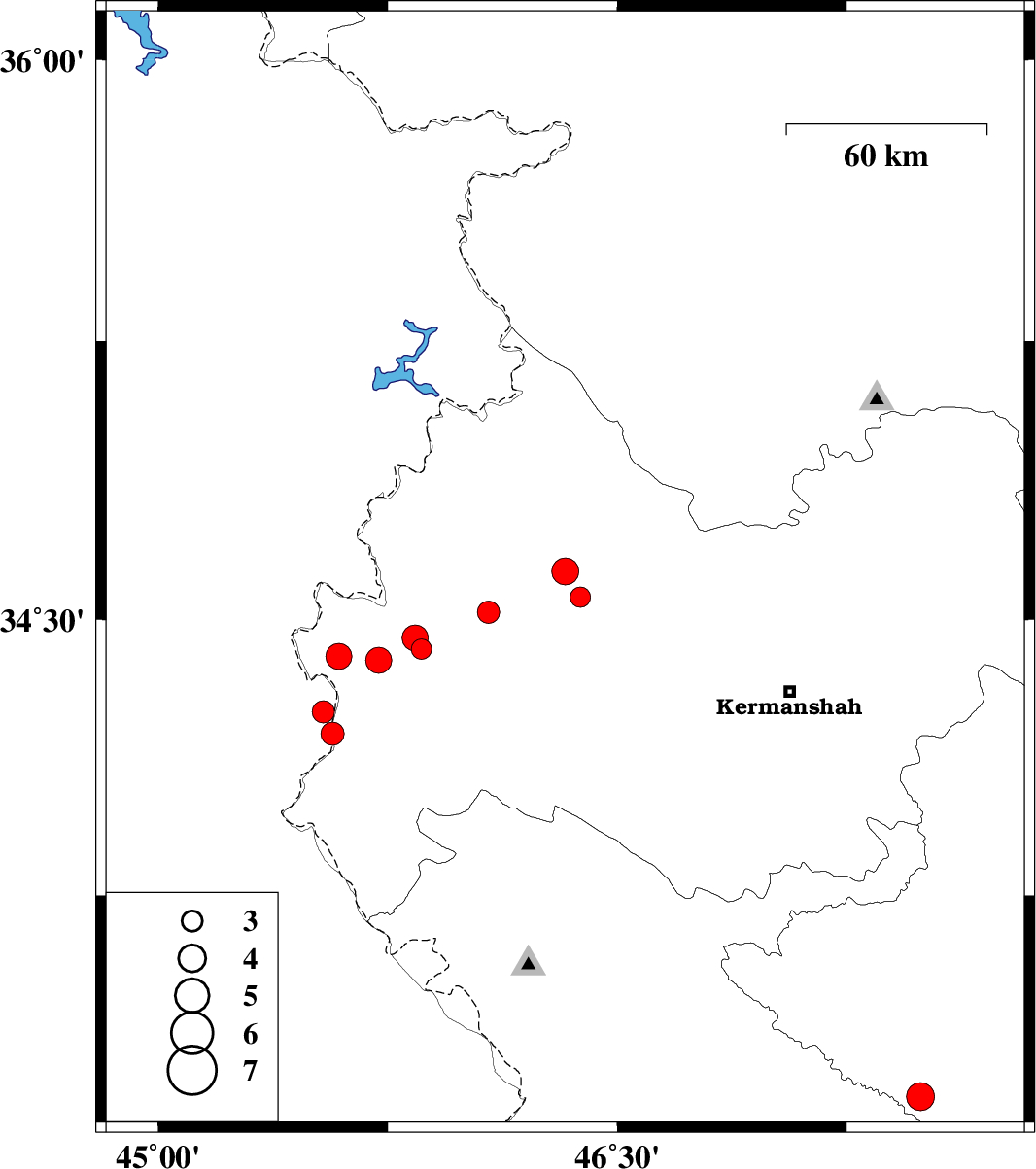 | 2019/08/30 | 11:28:09.9 | 15:58:09.9 | 34.42 | 45.86 | 10 | ML2.9 | Kermanshah Province, 6 km of Sar-e pol-e zahab | ||