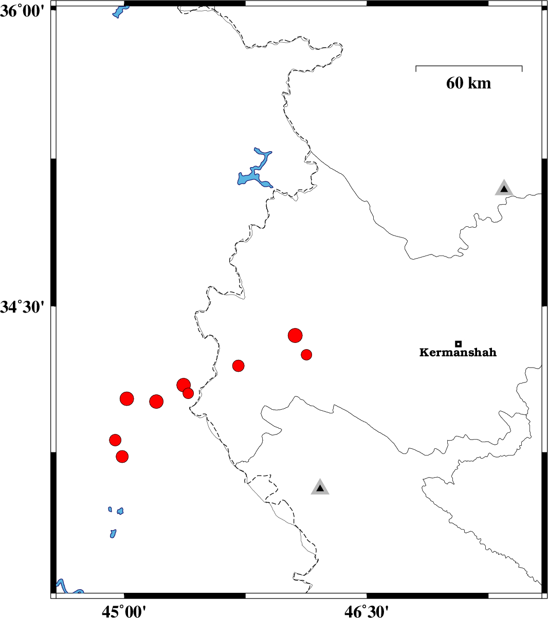 | 2019/08/30 | 11:28:09.9 | 15:58:09.9 | 34.42 | 45.86 | 10 | ML2.9 | Kermanshah Province, 6 km of Sar-e pol-e zahab | ||
