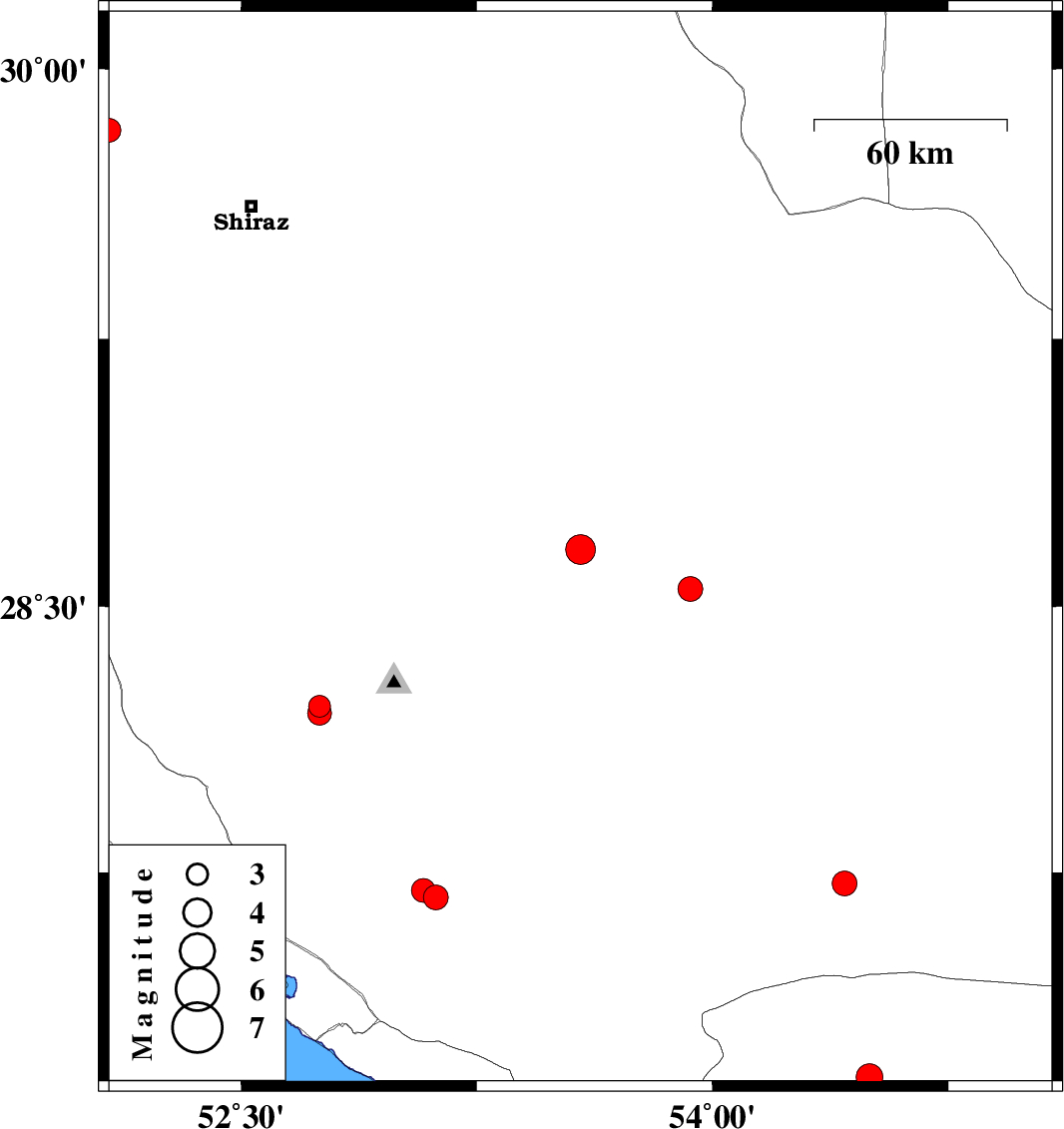 | 2019/09/26 | 12:36:14.3 | 16:06:14.3 | 28.2 | 52.75 | 11 | ML3.4 | Fars Province, 40 km South-West of Qir va Karzin | ||