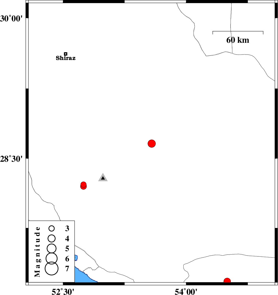| 2019/09/26 | 14:23:51.5 | 17:53:51.5 | 28.22 | 52.75 | 5 | ML3.1 | Fars Province, 39 km South-West of Qir va Karzin | ||