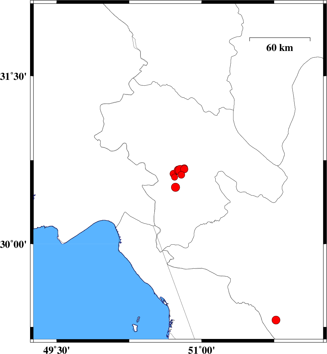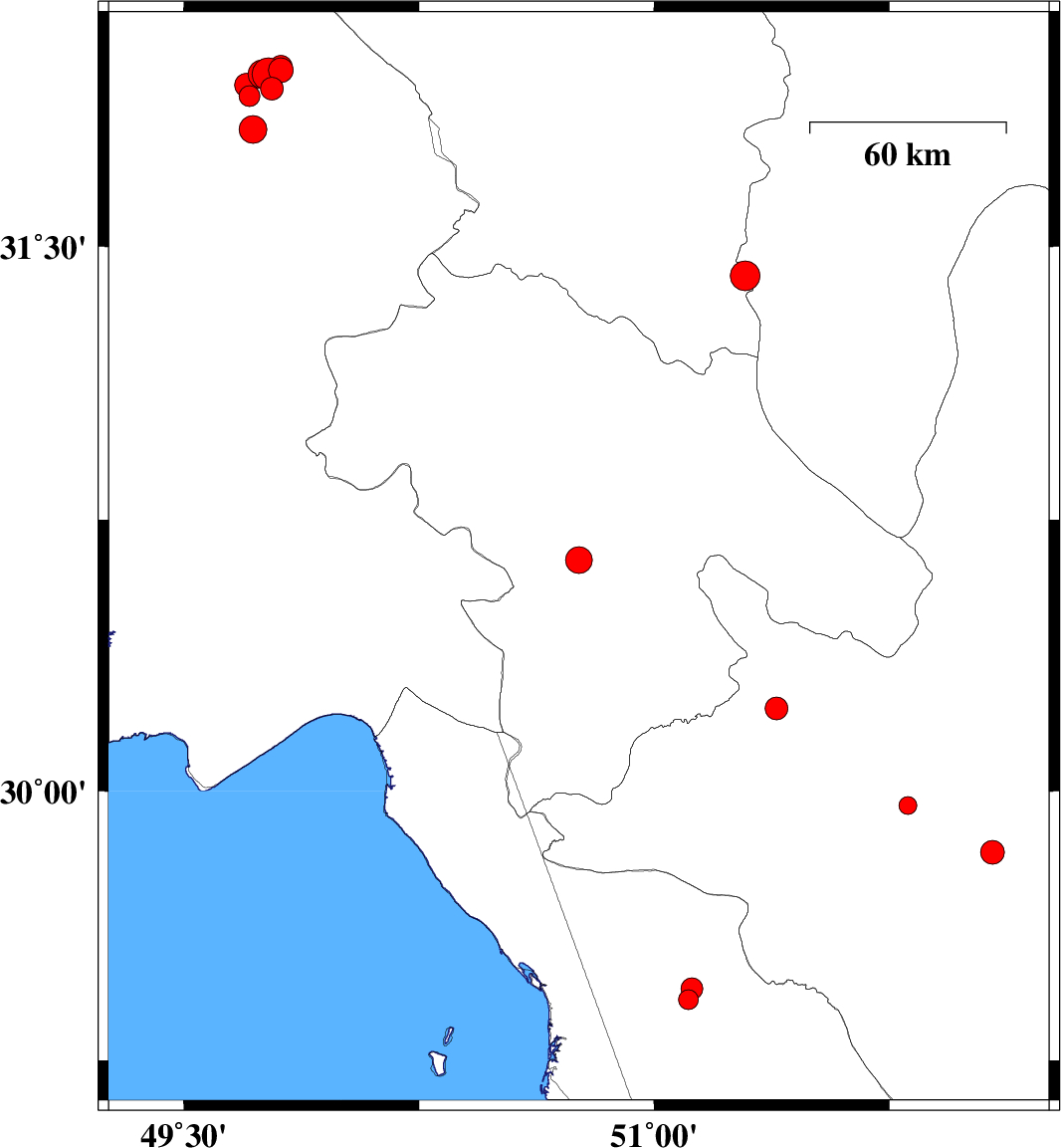 | 2019/09/09 | 03:33:47.0 | 08:03:47.0 | 30.23 | 51.39 | 22 | ML3.2 | Fars Province, 18 km North-West of Nurabad |