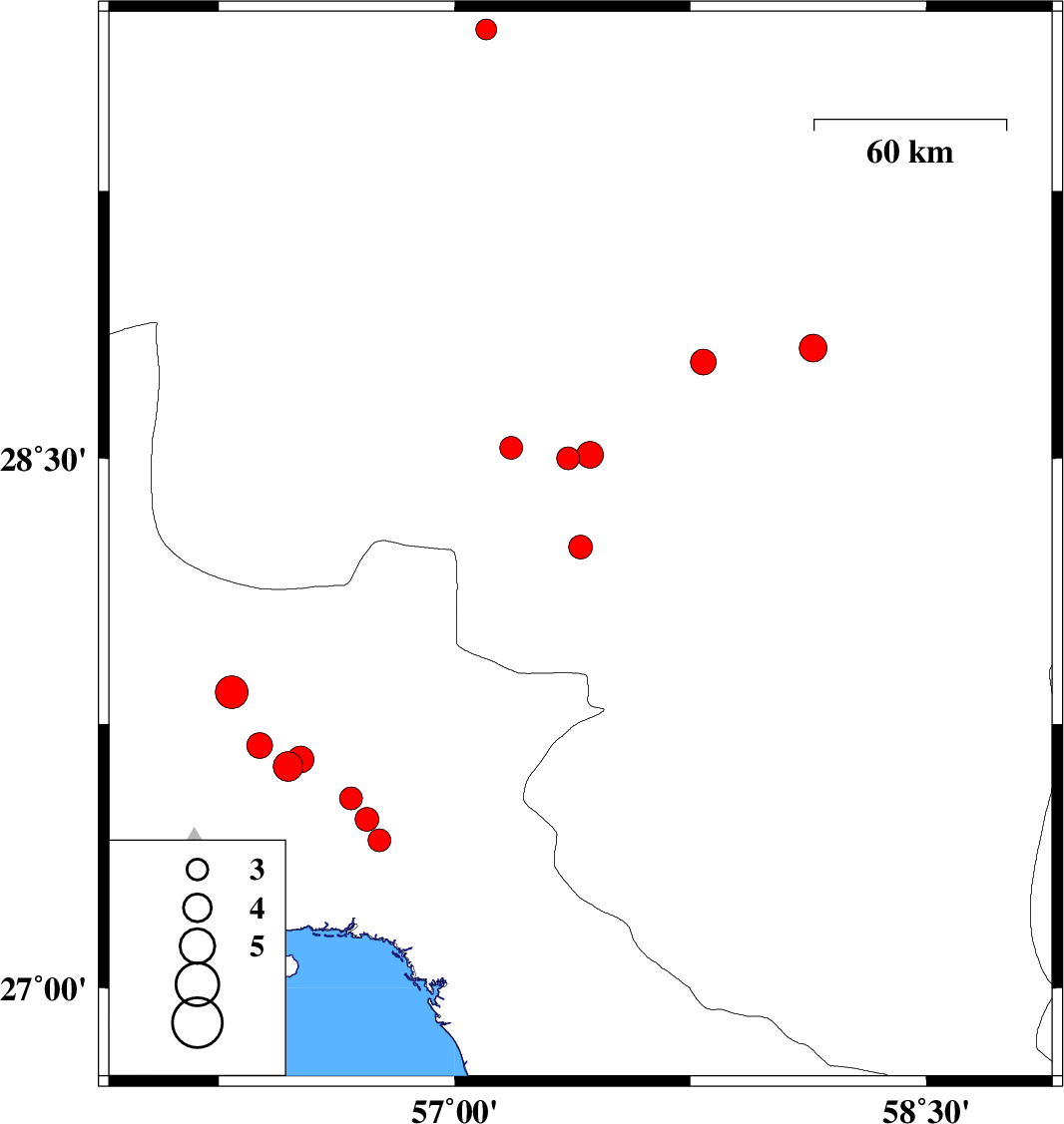 | 2019/10/02 | 11:09:59.3 | 14:39:59.3 | 28.25 | 57.4 | 10 | ML3.4 | Kerman Province, 44 km North-West of Kahnuj | ||