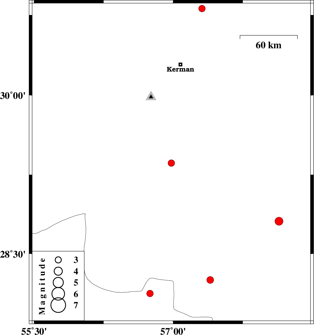| 2019/10/02 | 11:09:59.3 | 14:39:59.3 | 28.25 | 57.4 | 10 | ML3.4 | Kerman Province, 44 km North-West of Kahnuj | ||