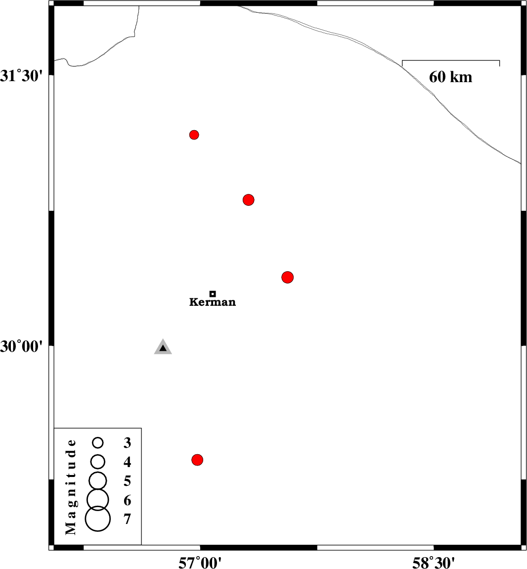 | 2019/10/04 | 23:30:08.3 | 03:00:08.3 | 31.17 | 56.96 | 5 | ML2.7 | Kerman Province, 18 km -East of Ravar | ||