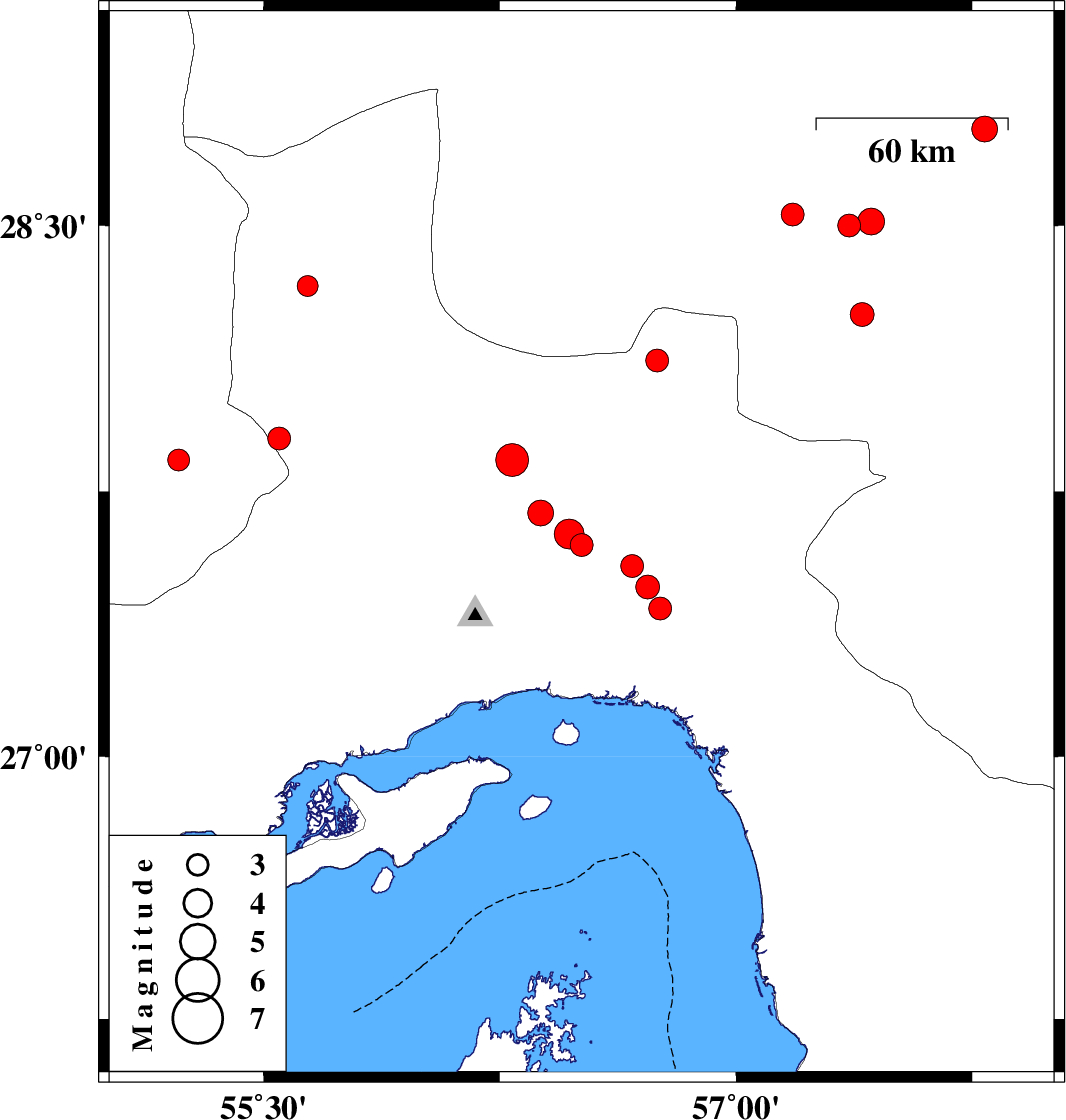| 2019/10/02 | 11:09:59.3 | 14:39:59.3 | 28.25 | 57.4 | 10 | ML3.4 | Kerman Province, 44 km North-West of Kahnuj | ||