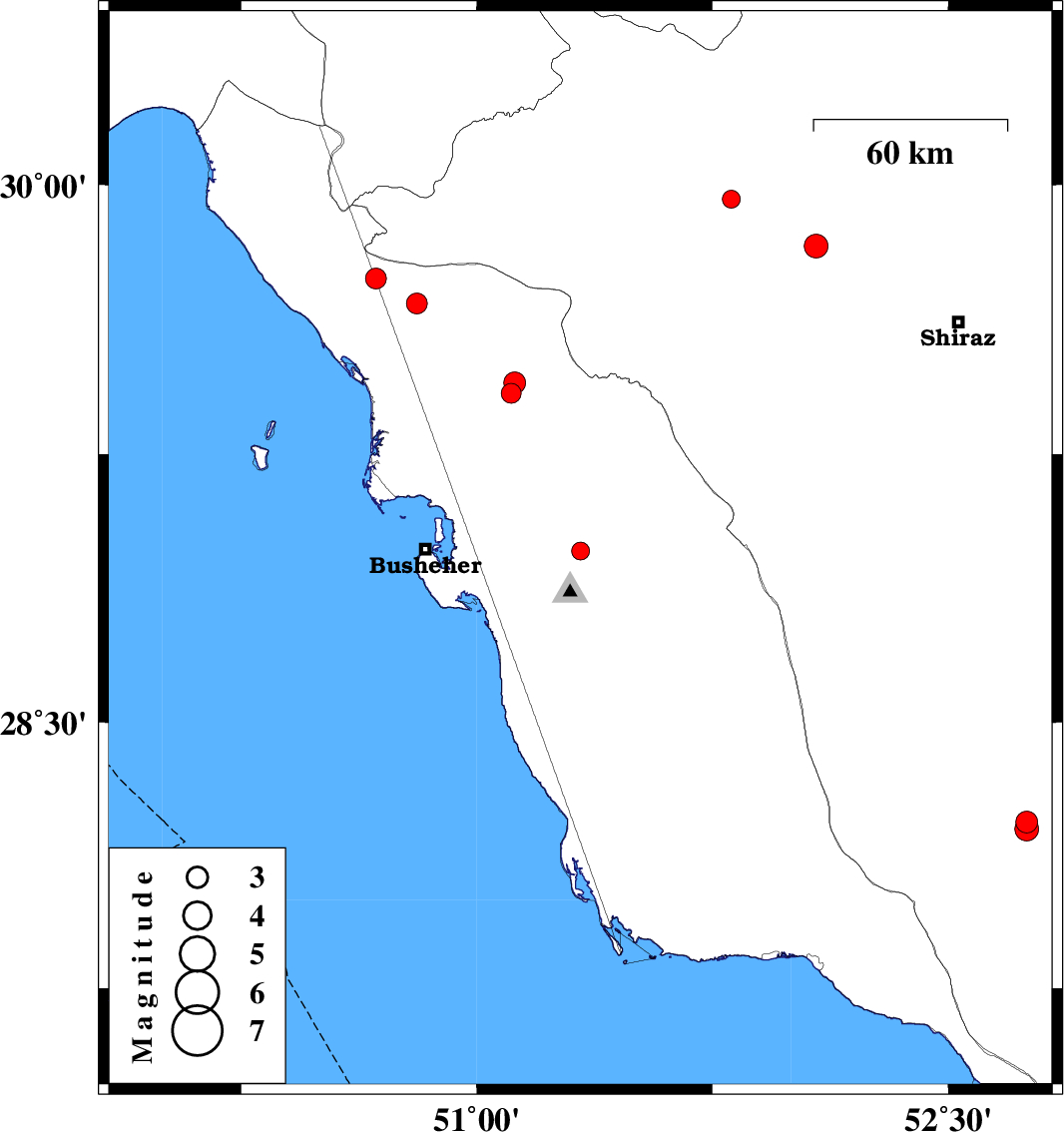 | 2019/09/22 | 19:04:16.1 | 22:34:16.1 | 29.45 | 51.12 | 14 | ML3.1 | Bushehr Province, 23 km North of Borazjan |