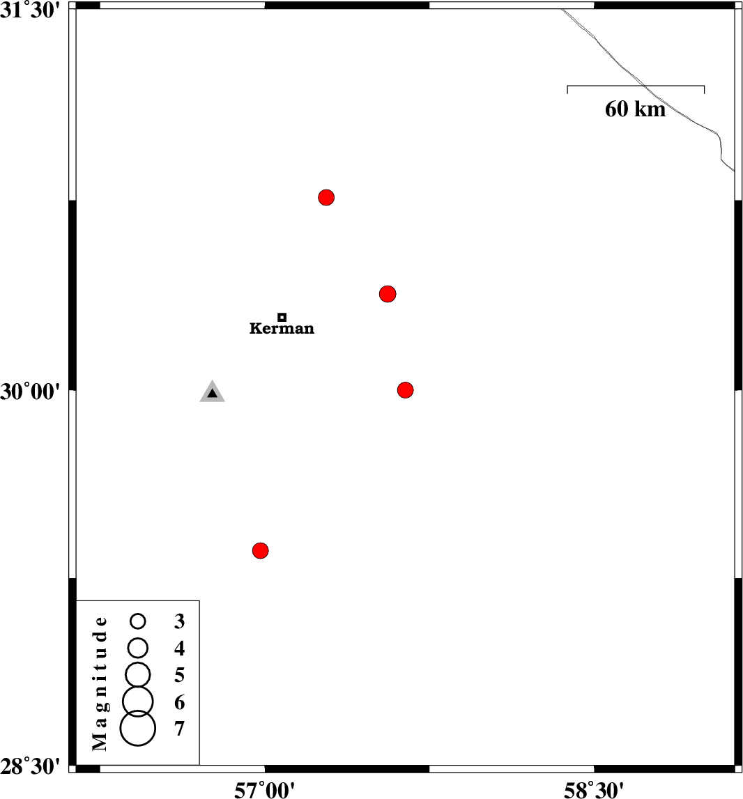 2019/10/12 | 05:07:10.7 | 08:37:10.7 | 30 | 57.64 | 14 | ML:3.2 | Kerman Province, 63 km South-East of Kerman | ||