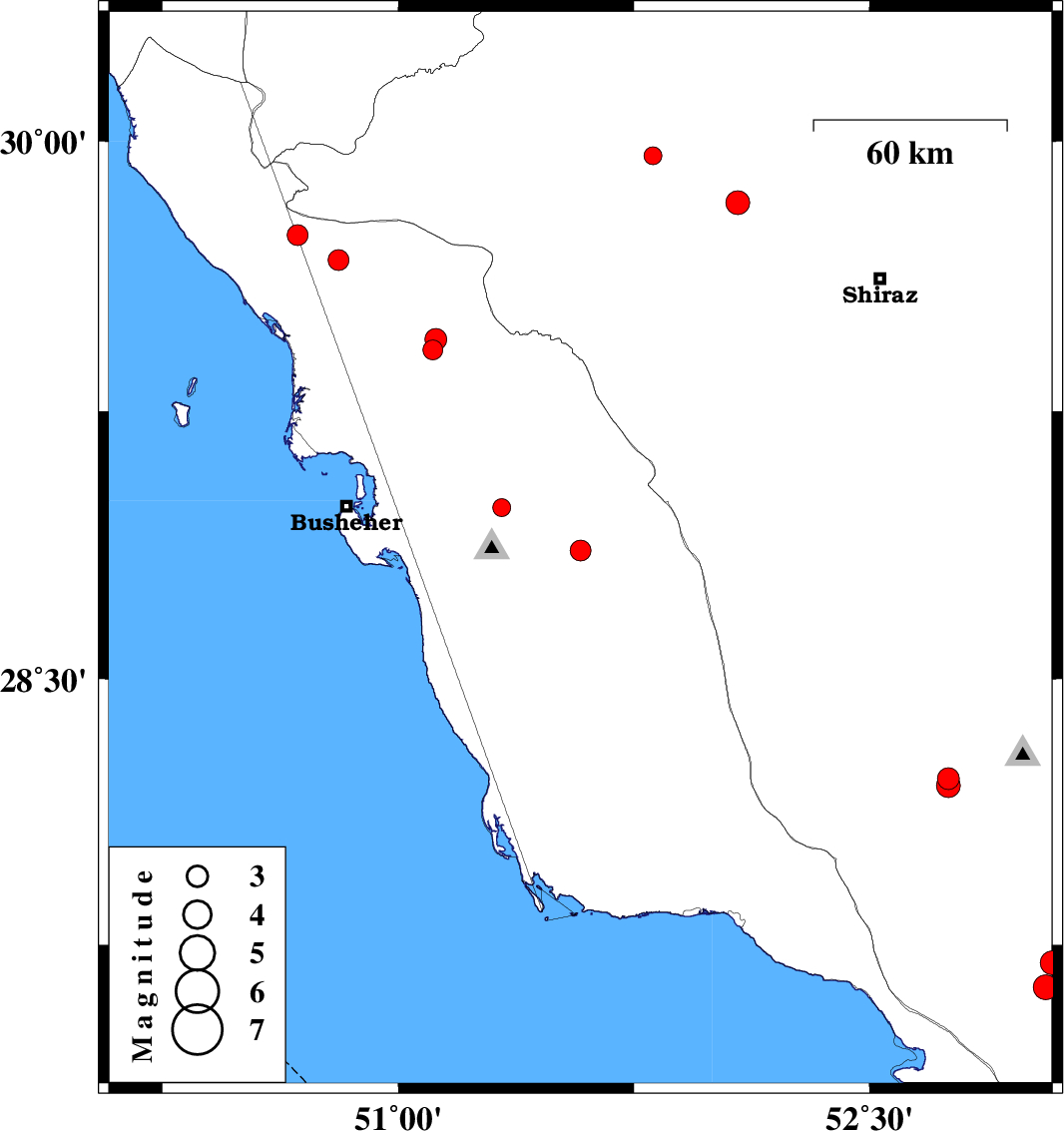 | 2019/09/22 | 19:04:16.1 | 22:34:16.1 | 29.45 | 51.12 | 14 | ML3.1 | Bushehr Province, 23 km North of Borazjan | ||