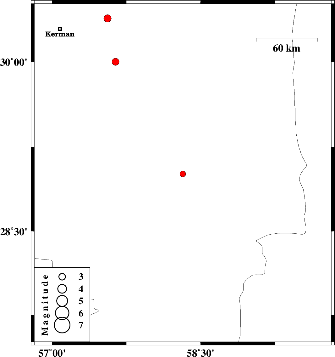 | 2019/10/12 | 05:07:10.7 | 08:37:10.7 | 30 | 57.64 | 14 | ML3.2 | Kerman Province, 63 km South-East of Kerman | ||