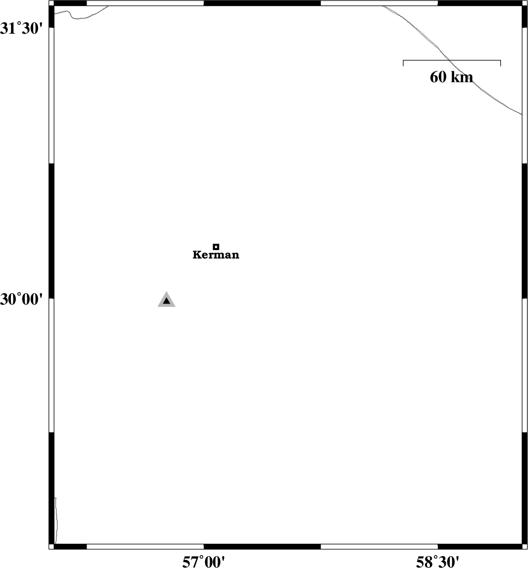 | 2019/10/12 | 05:07:10.7 | 08:37:10.7 | 30 | 57.64 | 14 | ML3.2 | Kerman Province, 63 km South-East of Kerman | ||