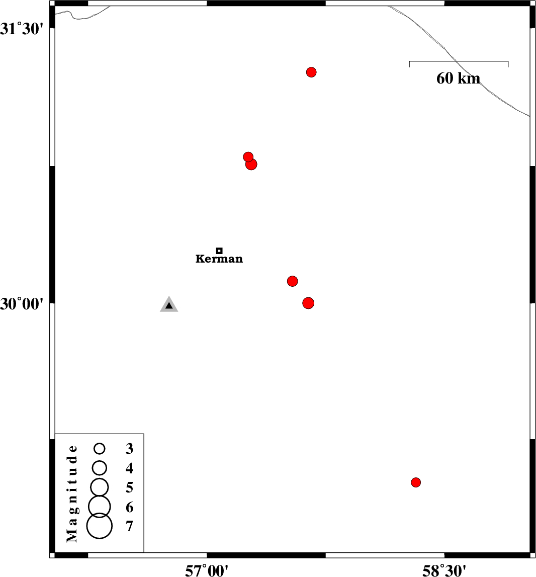 2019/10/15 | 01:20:17.8 | 04:50:17.8 | 30.12 | 57.54 | 14 | ML:2.9 | Kerman Province, 48 km South-East of Kerman | ||
