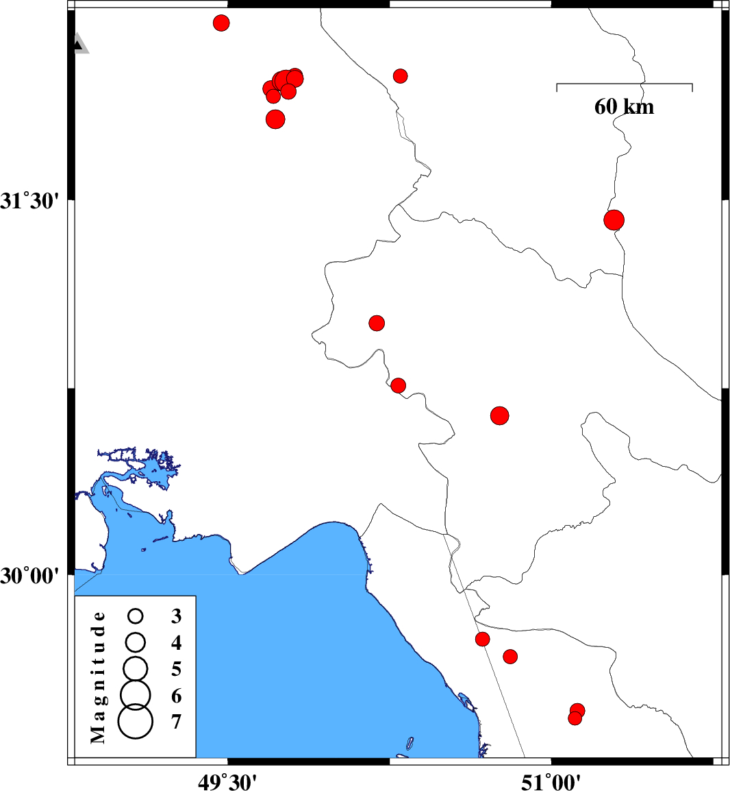 | 2019/09/22 | 19:04:16.1 | 22:34:16.1 | 29.45 | 51.12 | 14 | ML3.1 | Bushehr Province, 23 km North of Borazjan | ||