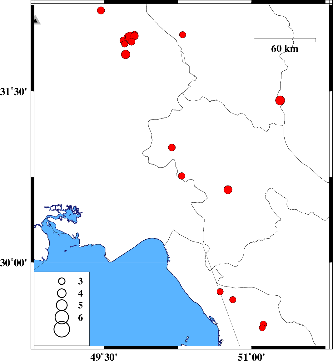 | 2019/09/25 | 13:17:34.8 | 16:47:34.8 | 31.82 | 49.72 | 28 | ML4 | Khoozestan Province, 14 km -West of Izeh | ||
