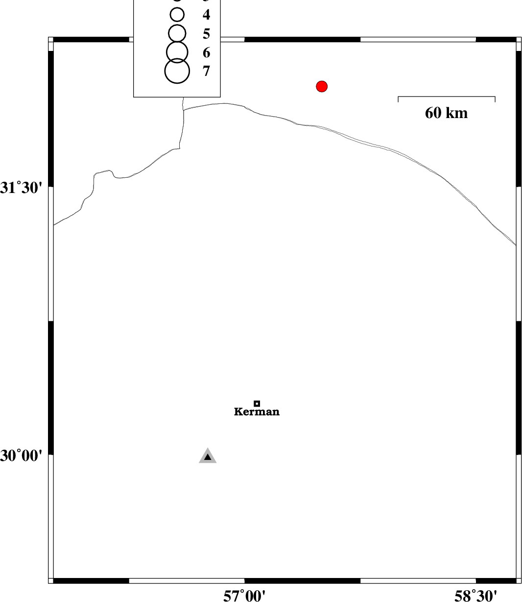 2019/09/19 | 07:24:15.4 | 11:54:15.4 | 29.86 | 57.62 | 10 | ML:4.1 | Kerman Province, 71 km South-East of Kerman |