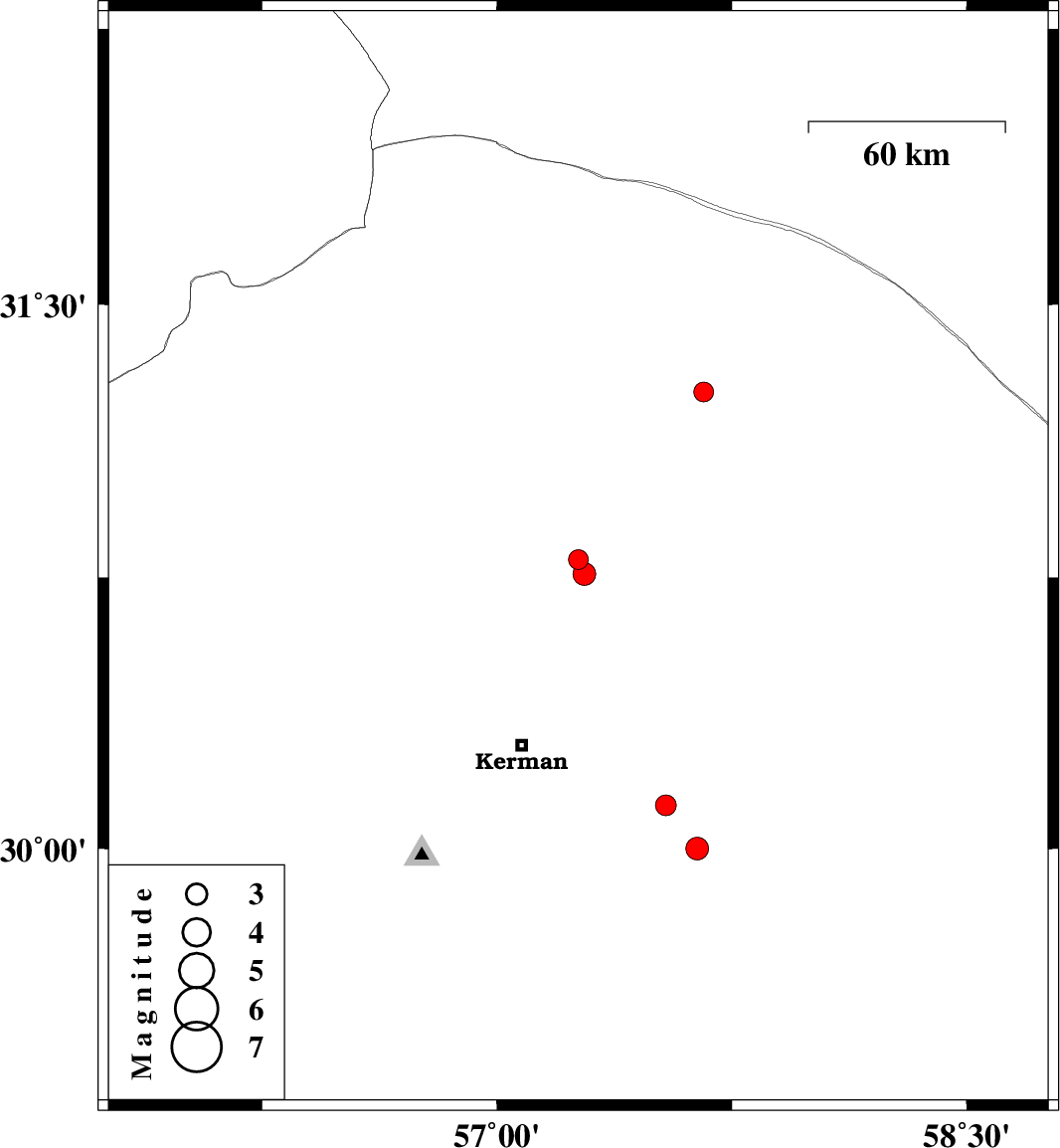 | 2019/10/12 | 05:07:10.7 | 08:37:10.7 | 30 | 57.64 | 14 | ML3.2 | Kerman Province, 63 km South-East of Kerman | ||