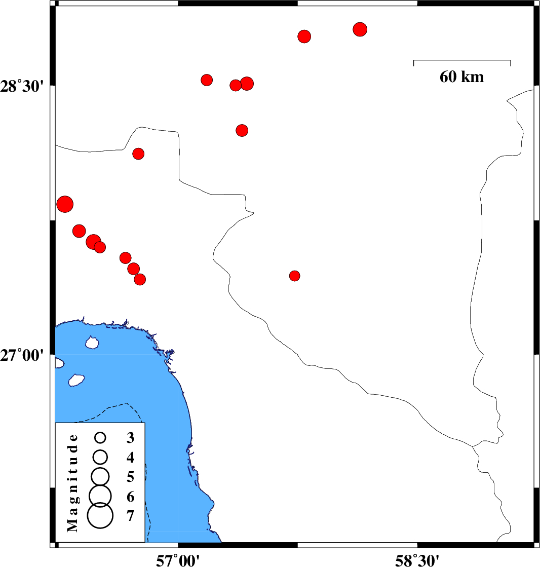 | 2019/10/02 | 11:09:59.3 | 14:39:59.3 | 28.25 | 57.4 | 10 | ML3.4 | Kerman Province, 44 km North-West of Kahnuj | ||