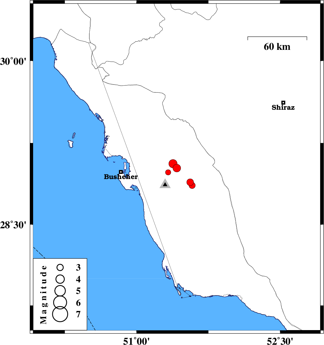 | 2019/10/18 | 03:00:12.0 | 06:30:12.0 | 29.06 | 51.38 | 10 | ML4 | Bushehr Province, 23 km North-East of Ahram | ||