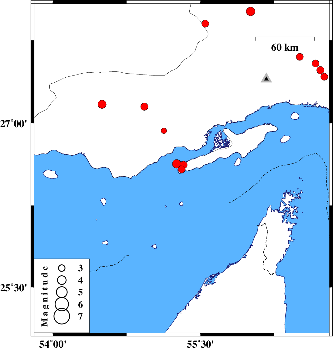 | 2019/10/18 | 04:09:38.8 | 07:39:38.8 | 26.63 | 55.26 | 14 | ML4 | Persian Gulf, 42 km North-East of Bandar-e lengeh | ||