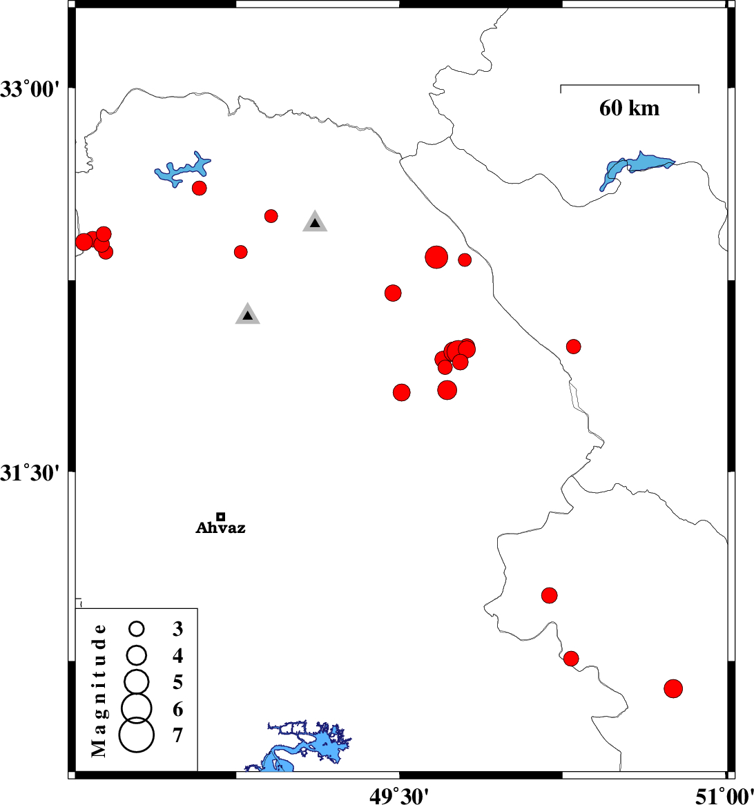 | 2019/10/13 | 02:06:27.2 | 05:36:27.2 | 32.43 | 48.14 | 14 | ML3.1 | Khoozestan Province, 20 km -West of Andimeshk | ||