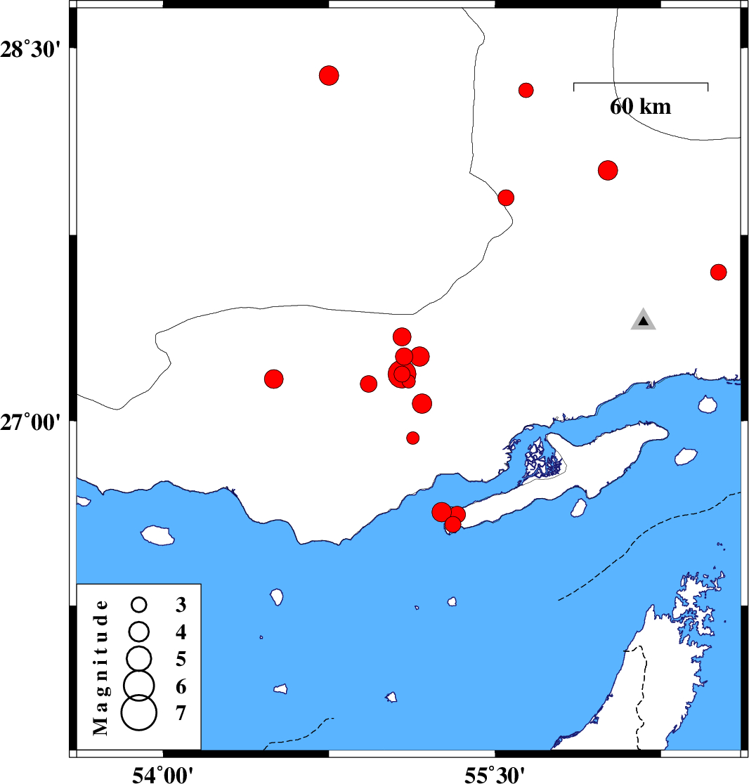 | 2019/10/18 | 04:09:38.8 | 07:39:38.8 | 26.63 | 55.26 | 14 | ML4 | Persian Gulf, 42 km North-East of Bandar-e lengeh | ||