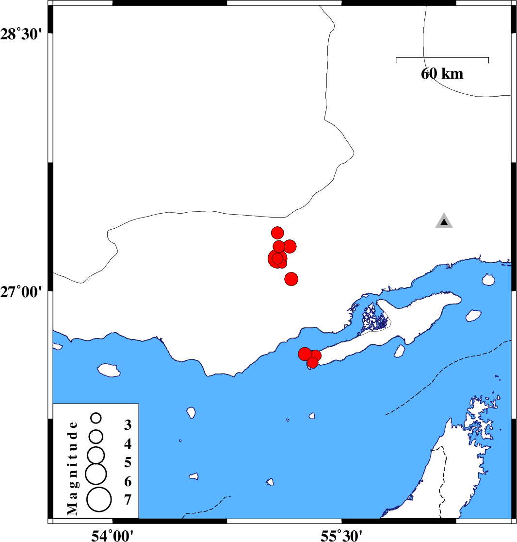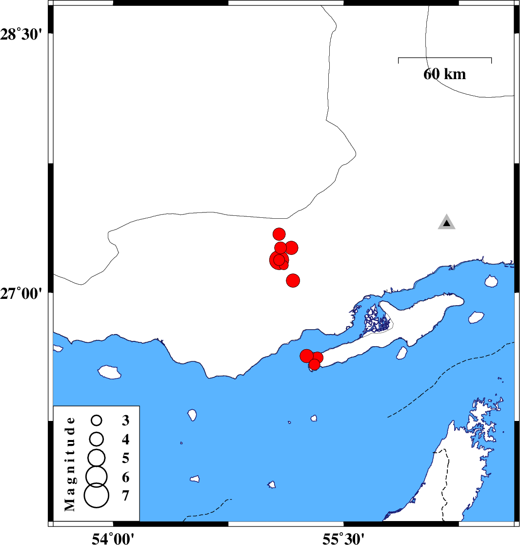 | 2019/10/18 | 04:09:38.8 | 07:39:38.8 | 26.63 | 55.26 | 14 | ML4 | Persian Gulf, 42 km North-East of Bandar-e lengeh | ||