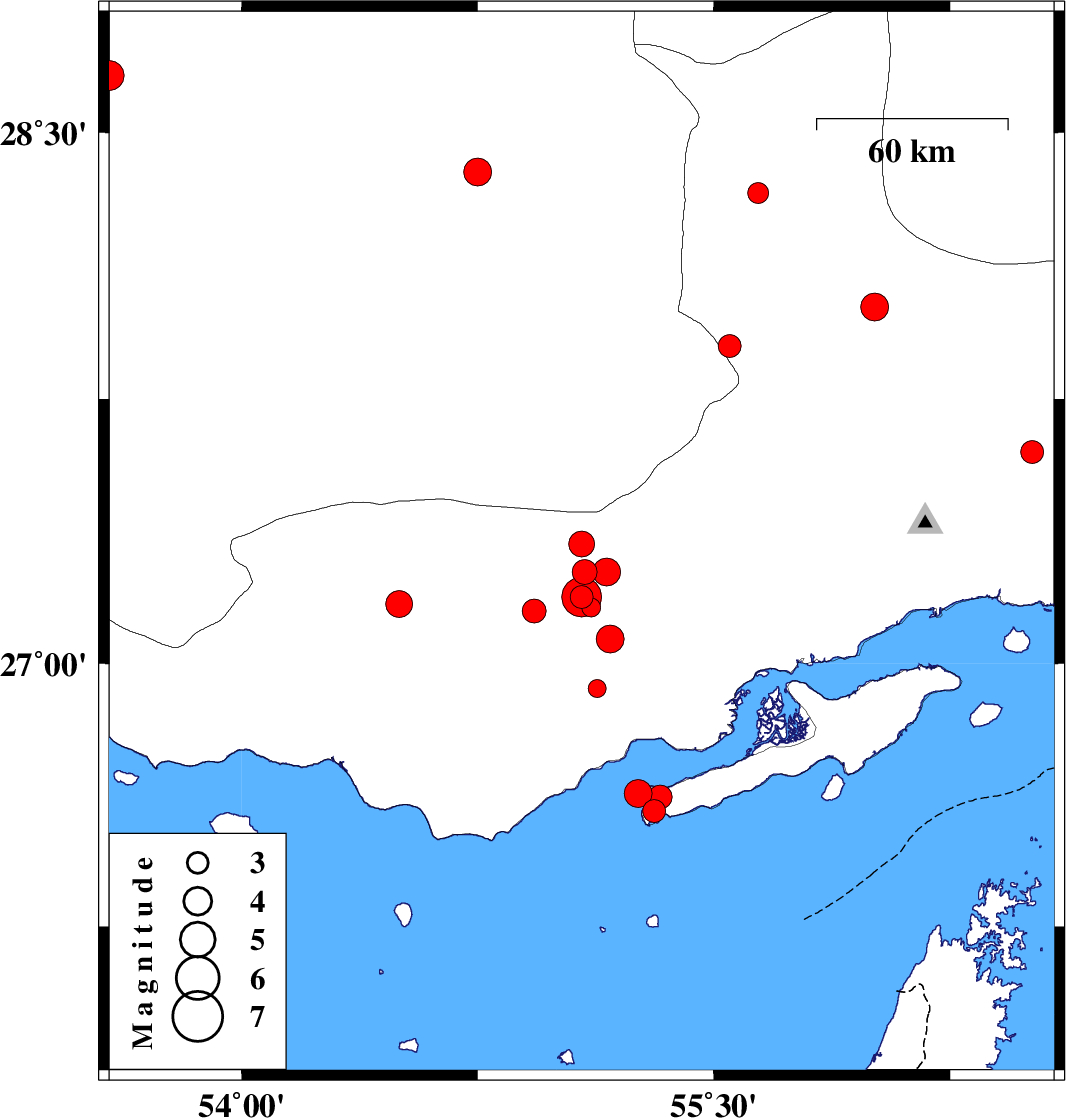 | 2019/10/18 | 04:09:38.8 | 07:39:38.8 | 26.63 | 55.26 | 14 | ML4 | Persian Gulf, 42 km North-East of Bandar-e lengeh | ||