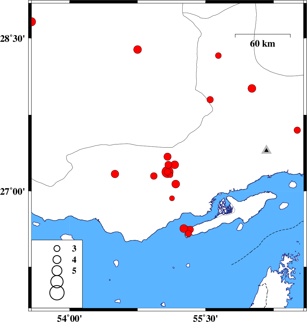 2019/10/22 | 04:33:20.1 | 08:03:20.1 | 27.07 | 55.17 | 14 | ML:3.9 | Hormozgan Province, 68 km North-East of Bandar-e lengeh | ||