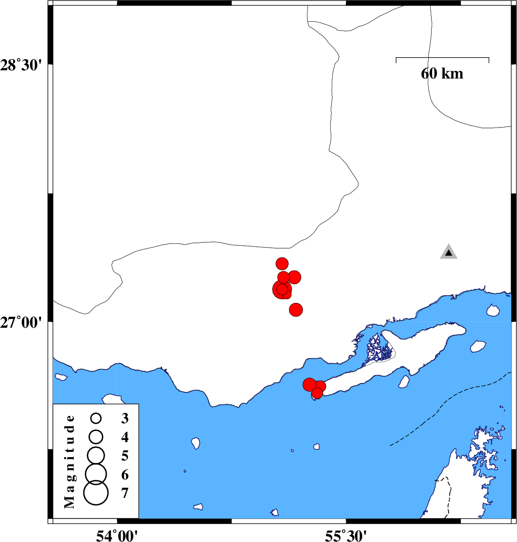 | 2019/10/18 | 04:09:38.8 | 07:39:38.8 | 26.63 | 55.26 | 14 | ML4 | Persian Gulf, 42 km North-East of Bandar-e lengeh | ||