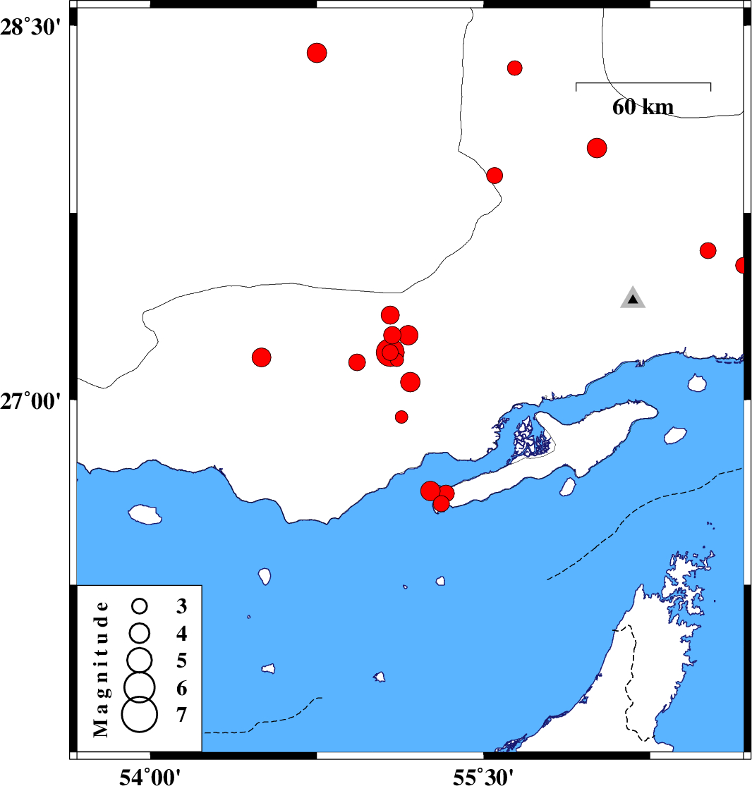 | 2019/10/18 | 04:09:38.8 | 07:39:38.8 | 26.63 | 55.26 | 14 | ML4 | Persian Gulf, 42 km North-East of Bandar-e lengeh | ||