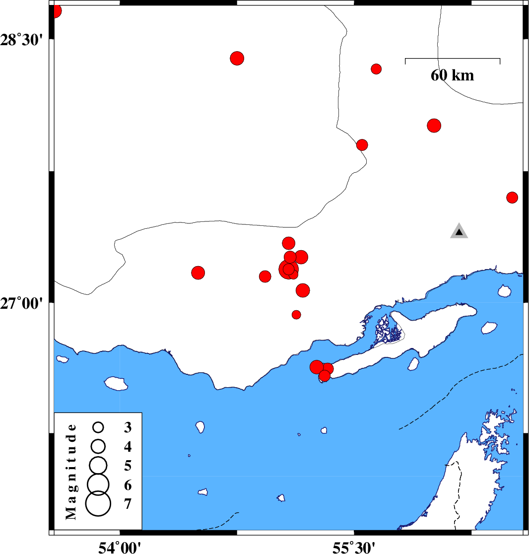 2019/10/21 12:06:32.8 15:36:32.8 27.2655.168 ML4 Hormozgan Province, 79 km -East of Bastak
