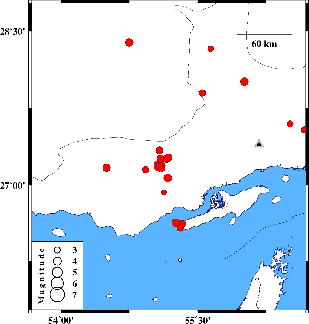 | 2019/10/18 | 04:09:38.8 | 07:39:38.8 | 26.63 | 55.26 | 14 | ML4 | Persian Gulf, 42 km North-East of Bandar-e lengeh | ||